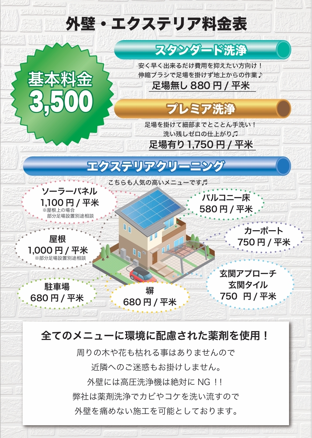 柔らかいブラシで汚れを浮かし外壁を傷めない洗浄ができます。